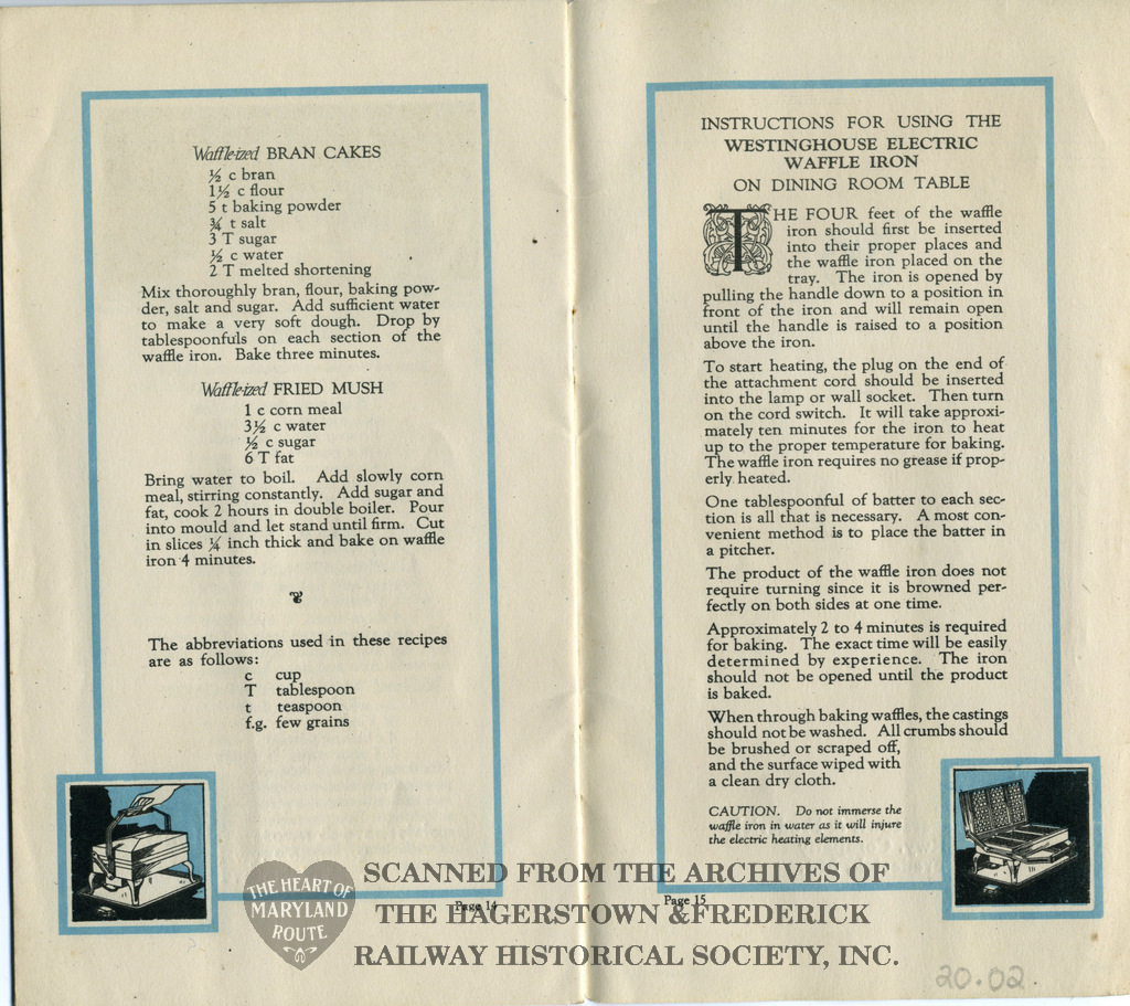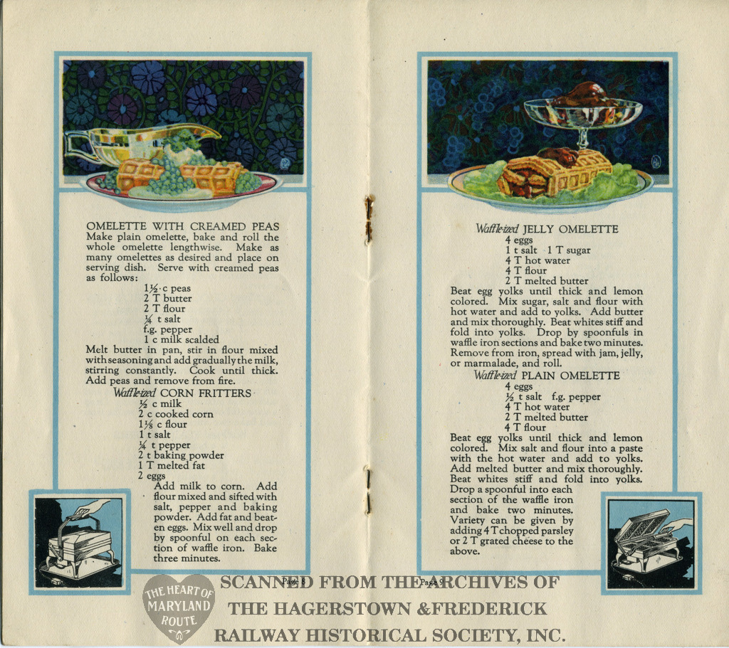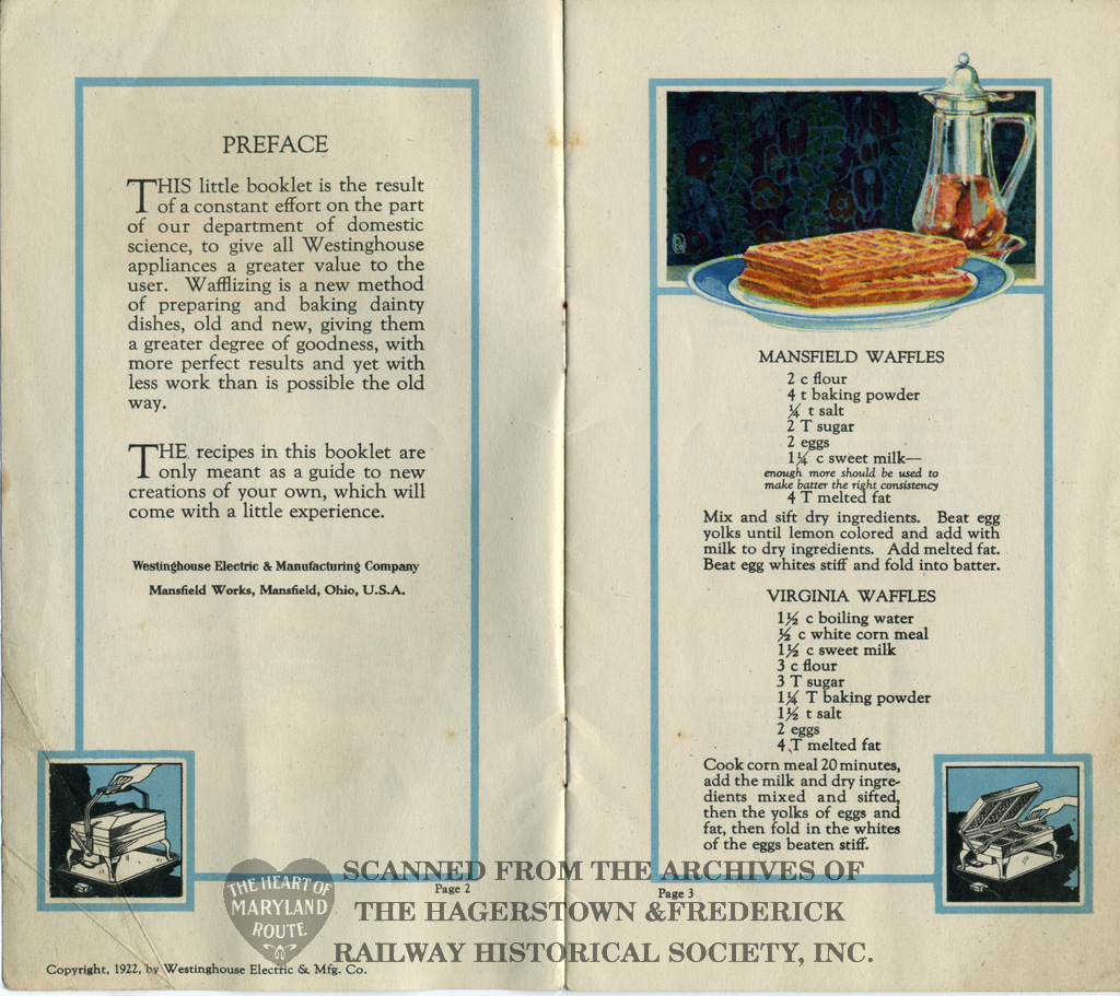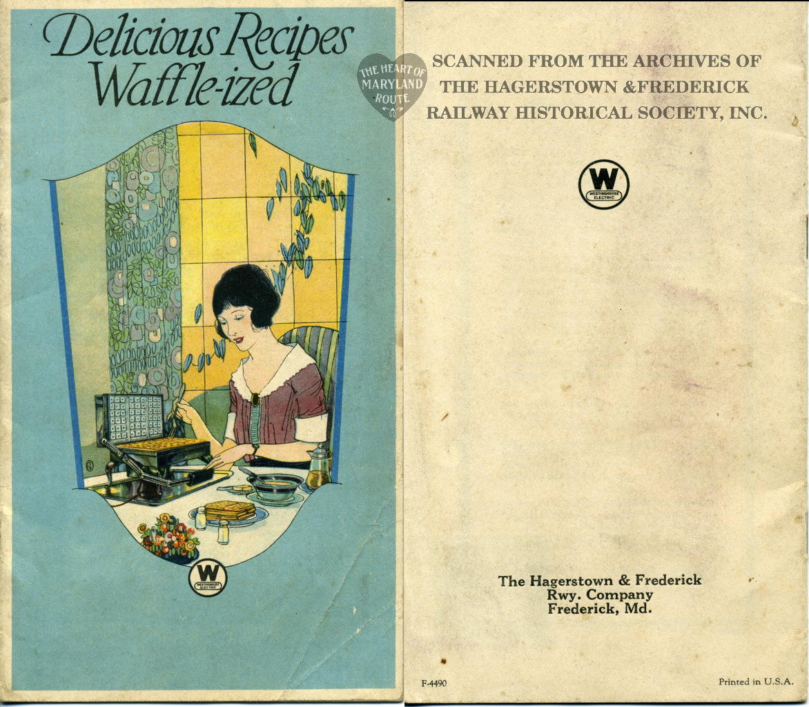 This recipe book was produced in 1922 to advertise Westinghouse’s new electric waffle iron. It contains 30 possible meals made using the appliance. The iron was available for purchase from the Hagerstown and Frederick Railway Company and because of this the booklet bears the railway name on the rear cover.