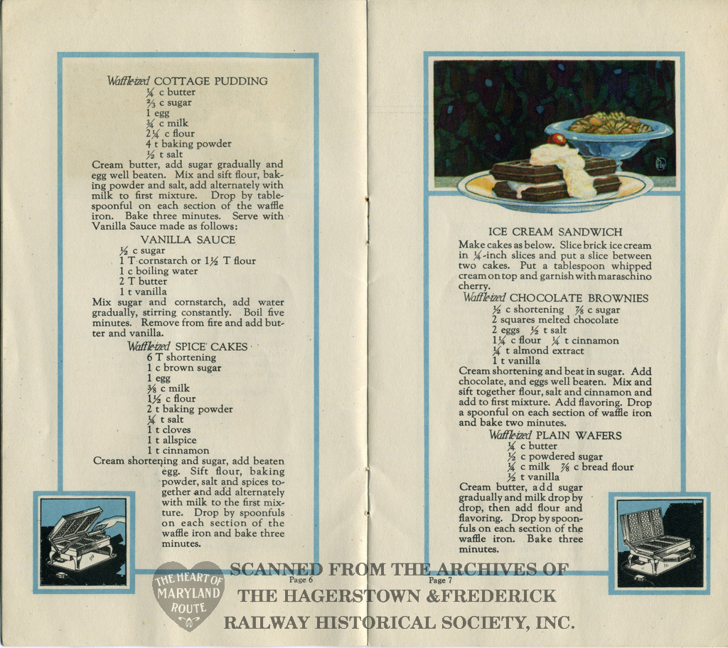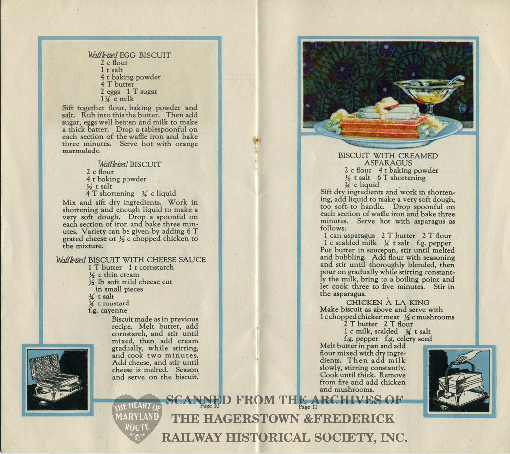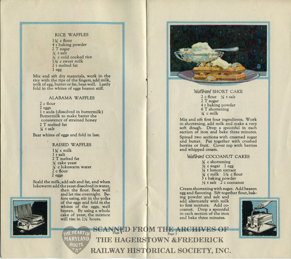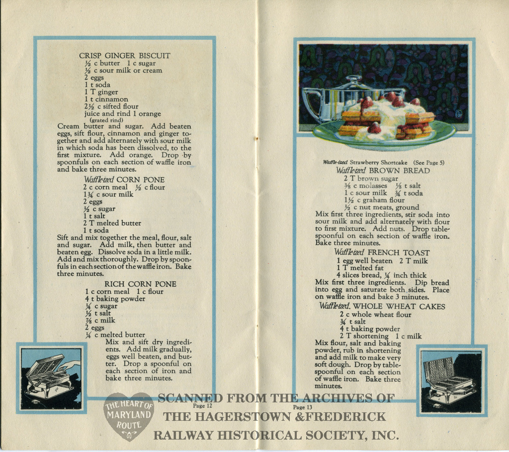 This recipe book was produced in 1922 to advertise Westinghouse’s new electric waffle iron. It contains 30 possible meals made using the appliance. The iron was available for purchase from the Hagerstown and Frederick Railway Company and because of this the booklet bears the railway name on the rear cover.
