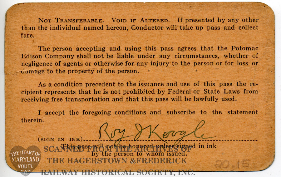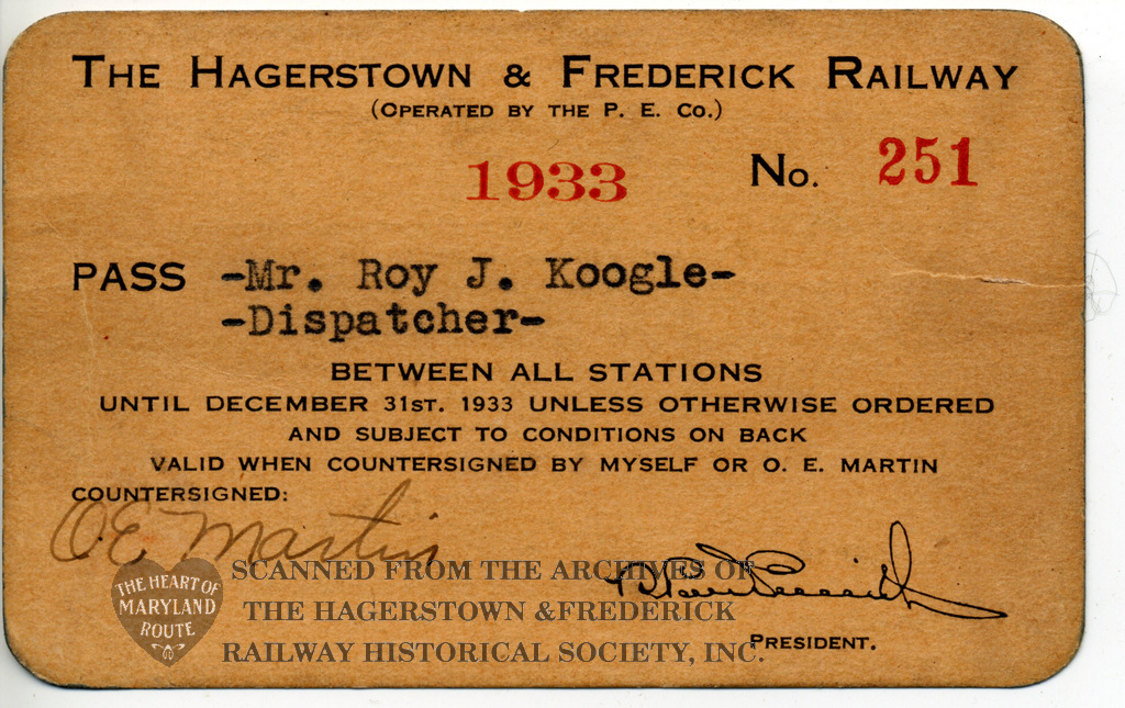 This pass was provided to dispatcher Roy J. Koogle and allowed him unlimited access to ride H&F trolleys. Upon boarding he would simply be required to sign a small slip with his name and pass number which the motorman would turn in instead of a ticket or fare.