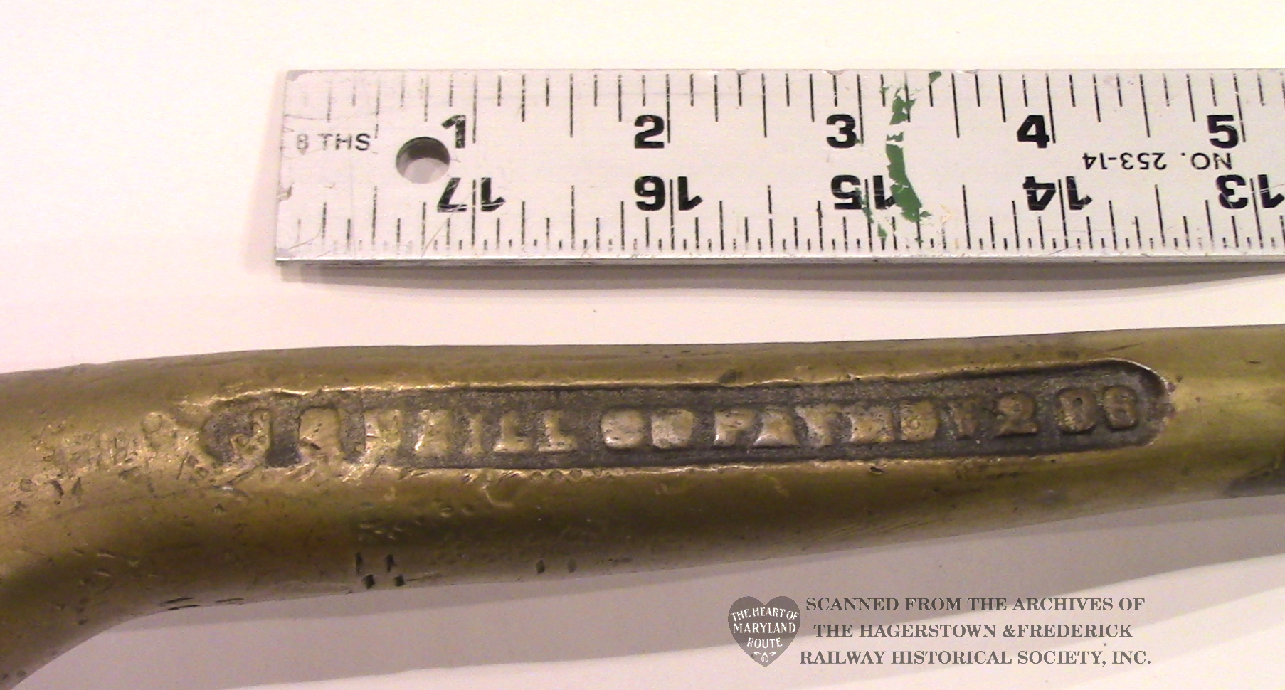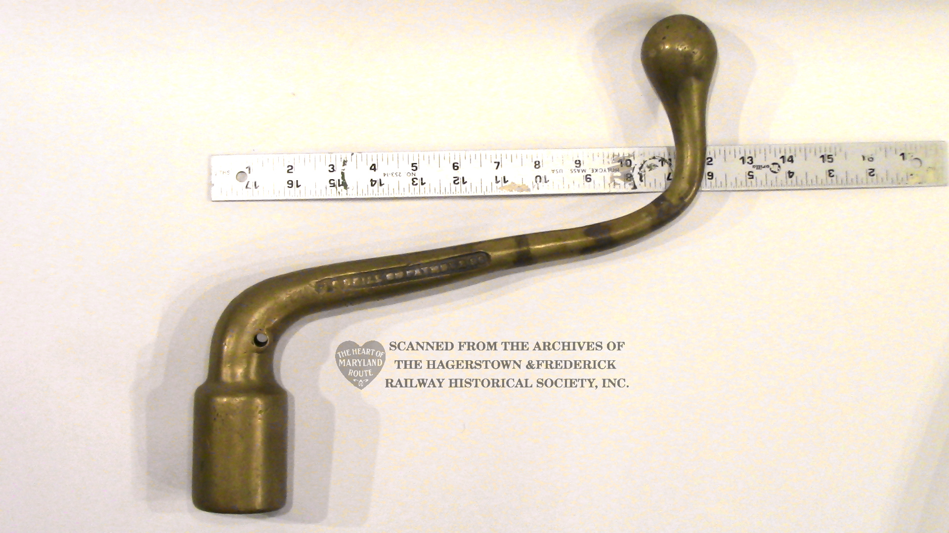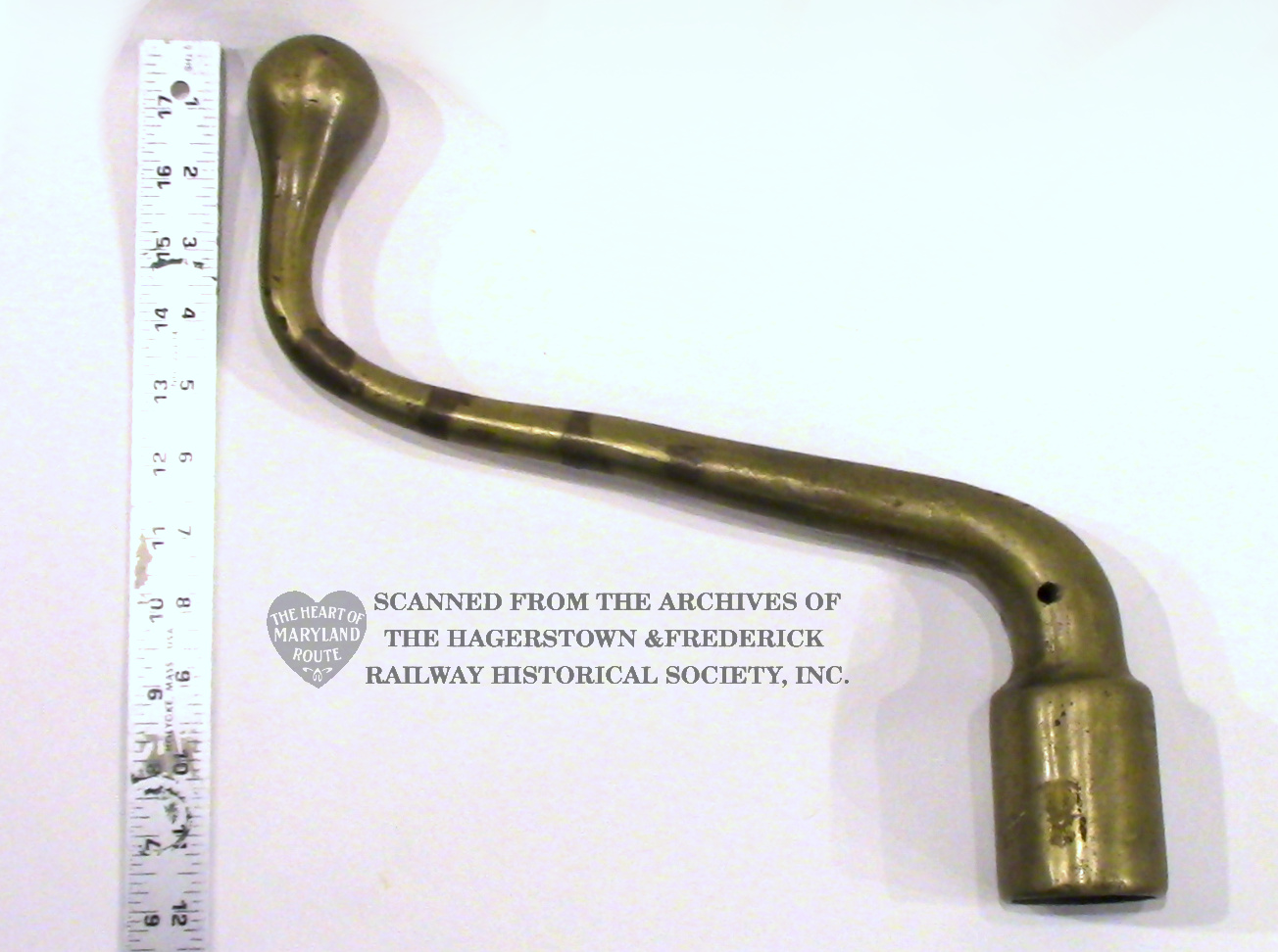 This handle operated the mechanical brake of one of the J.G. Brill Company manufactured H&F Interurban Combines. The handle would be attached to a vertical pole to the right of the motorman. A ratchet system on the floor would hold the pole in position when the handle was rotated, with a foot activated release switch in order to allow the brake handle to be rotated in the opposite direction for release.