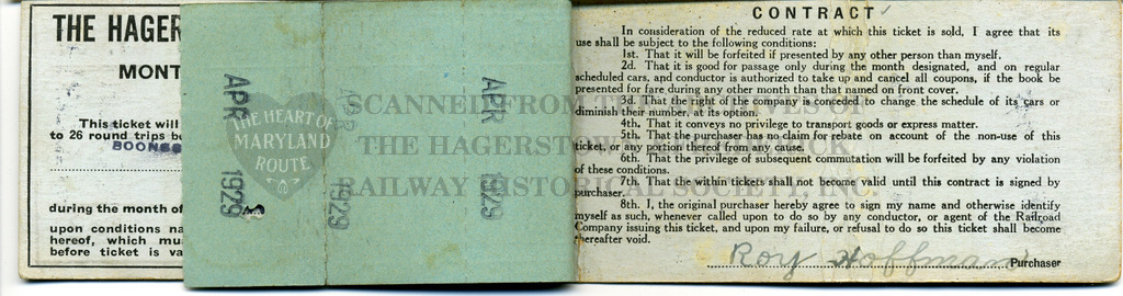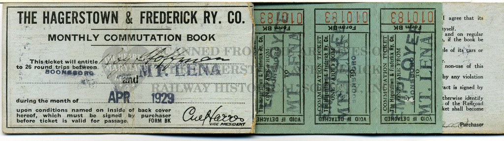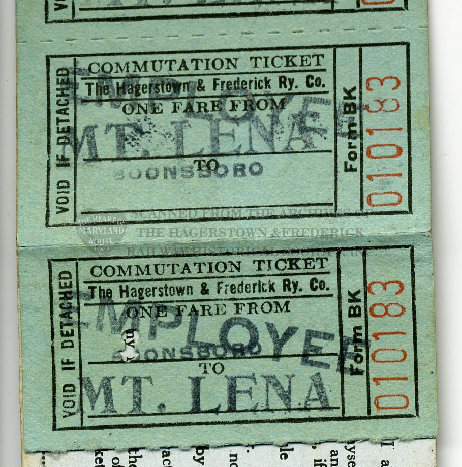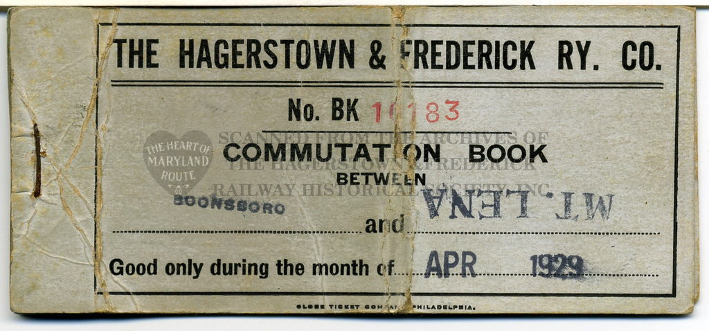 This book of tear tickets is an example of common “Commutation” or monthly commuter booklets provided to regular riders. The specific passenger who used this booklet was Roy Hoffman of Mt. Lena, son of a company employee and a student who rode the trolleys from home to Boonsboro High School daily.