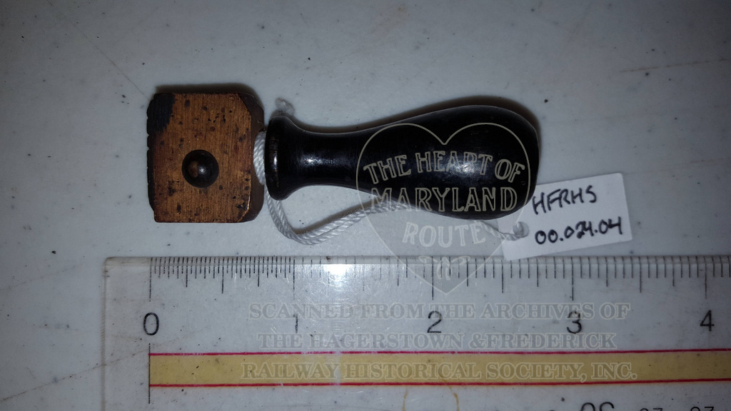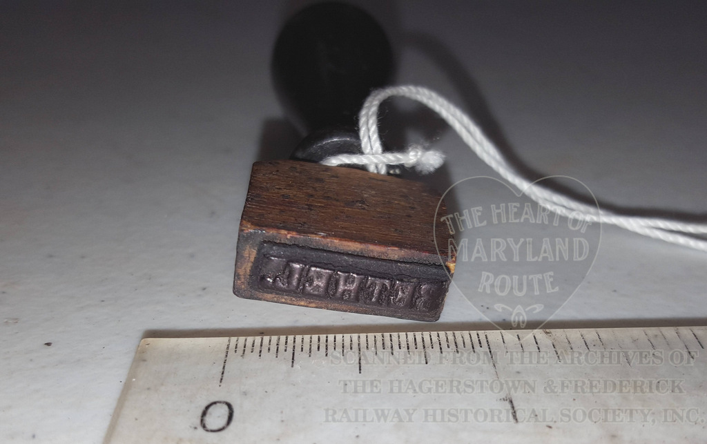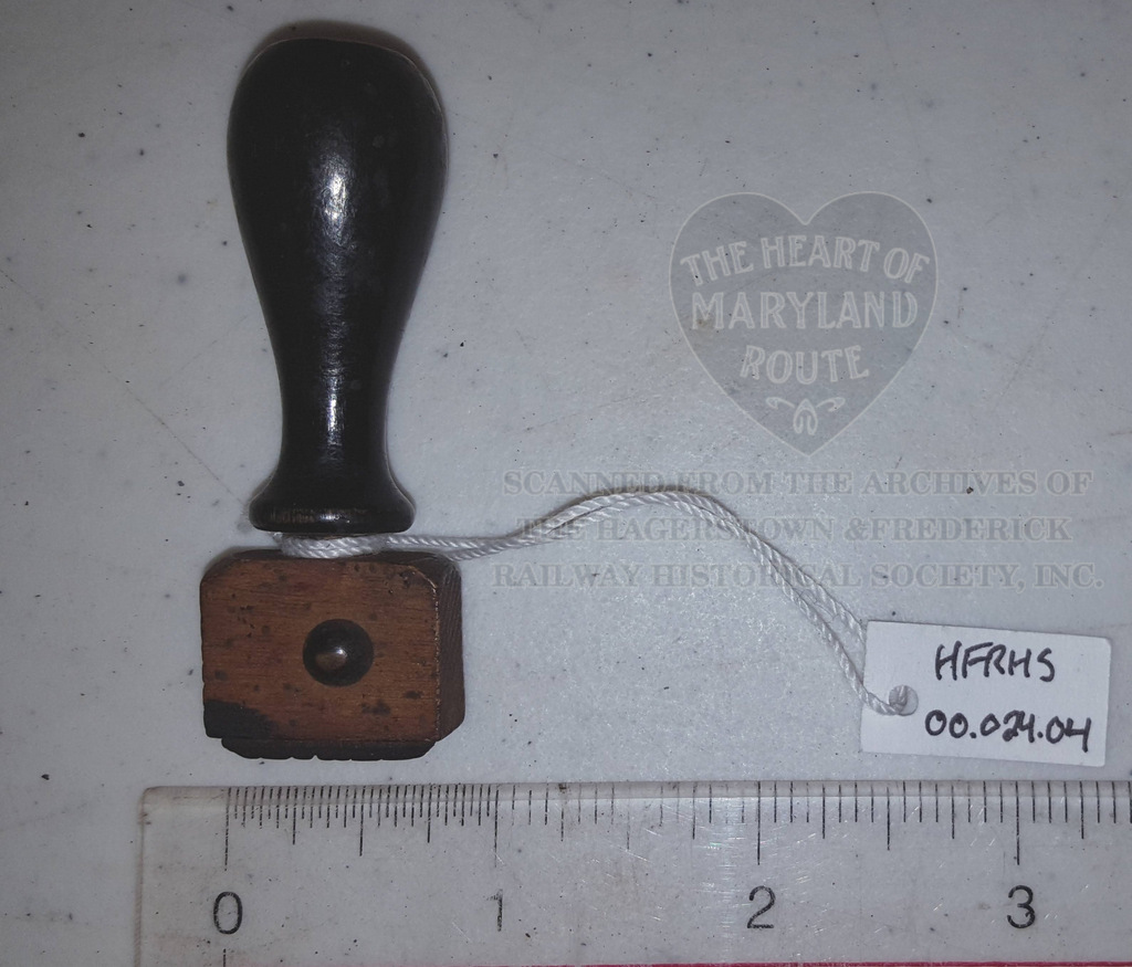 Rubber stamps such as this were used by station agents and other company officials to mark tickets and documents quickly and officially with origin or destination points. This stamp reads “Bethel”