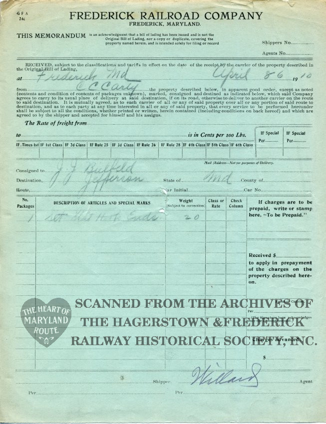 This document is a record of a shipment from C.C. Carty, a furniture maker and undertaker in Frederick who also supplied building materials. It was delivered by a trolley to Jefferson where the customer could pick it up at the station.