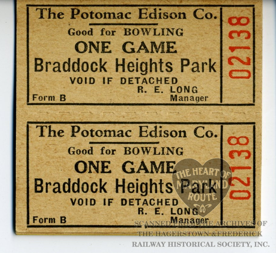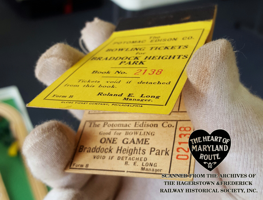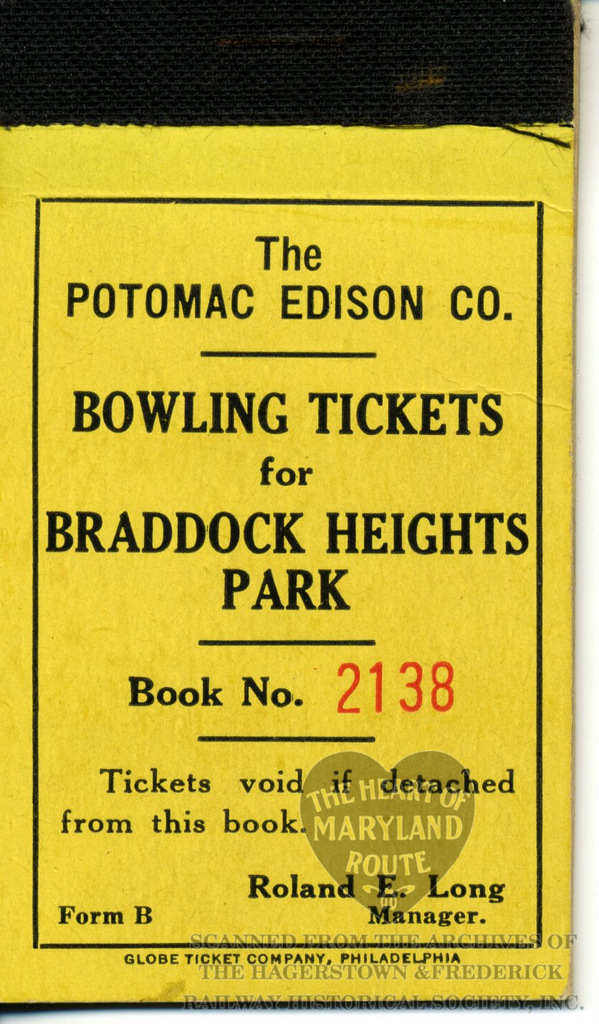 This booklet of small tear-out coupon tickets was purchased at Braddock Heights Park and was used to pay for games of bowling in the basement of the “Casino” building, later known as the Braddock Heights Roller Rink.