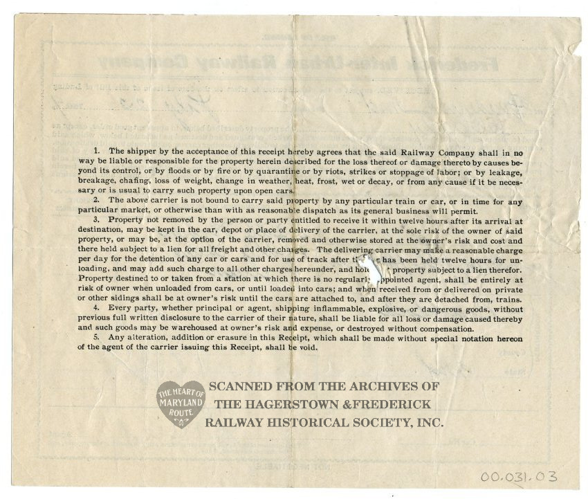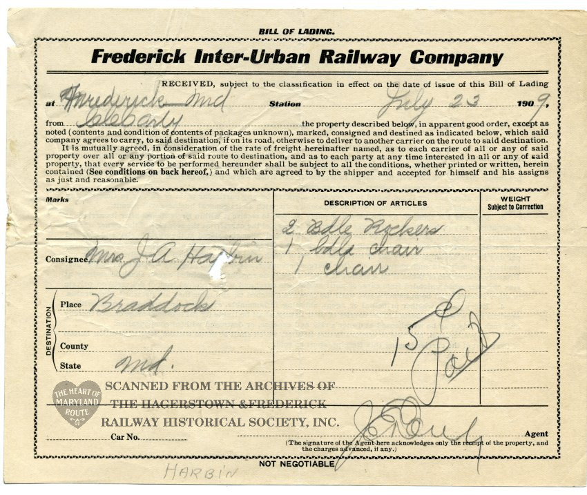 This document records a shipment of furniture from C.C. Carty’s store on East Patrick Street in Frederick to Mrs. J.A. Harbin of Braddock Heights on July 23, 1909. The shipment was handled by the Frederick Inter-Urban Railway, a “paper company” formed by the Frederick & Middletown Railway to handle out-of-city services between towns. F.I.U.Ry. was one of many companies combined during mergers that resulted in the Hagerstown & Frederick Railway.
