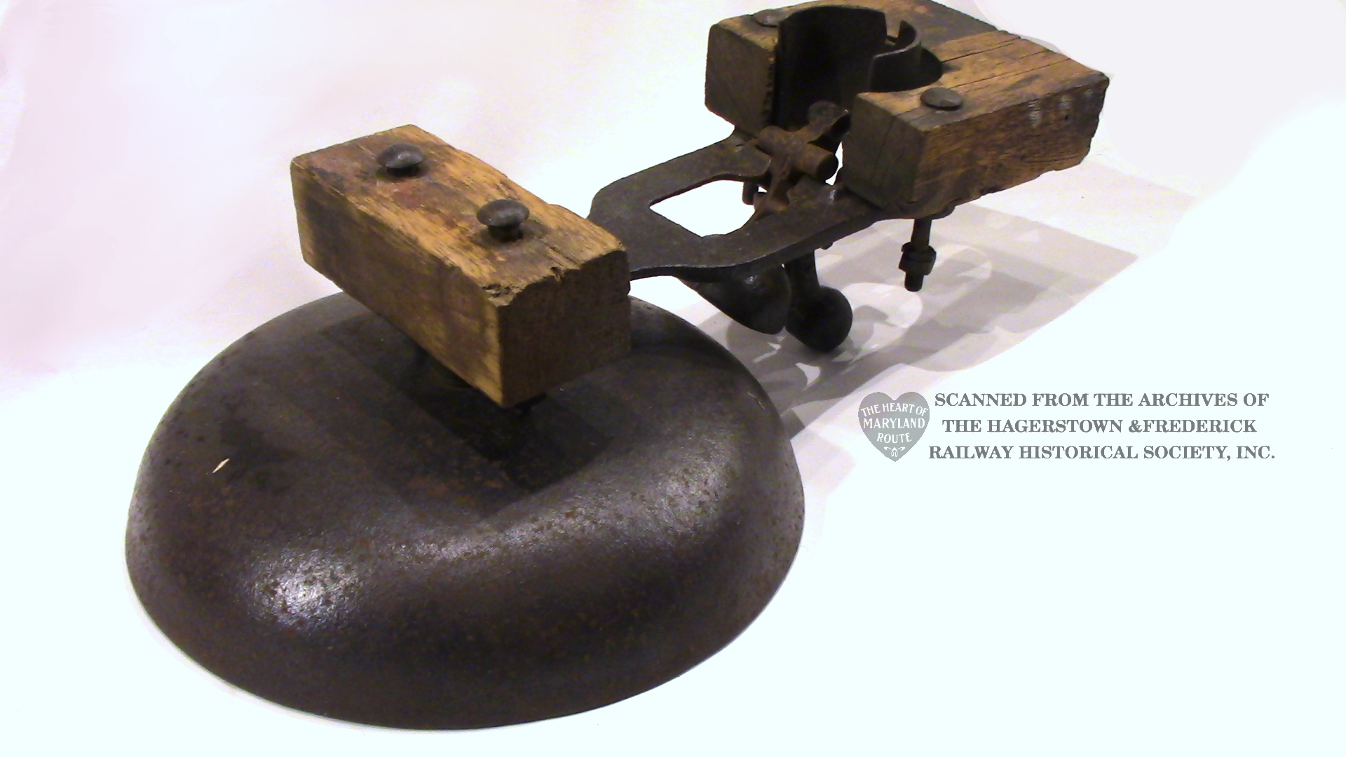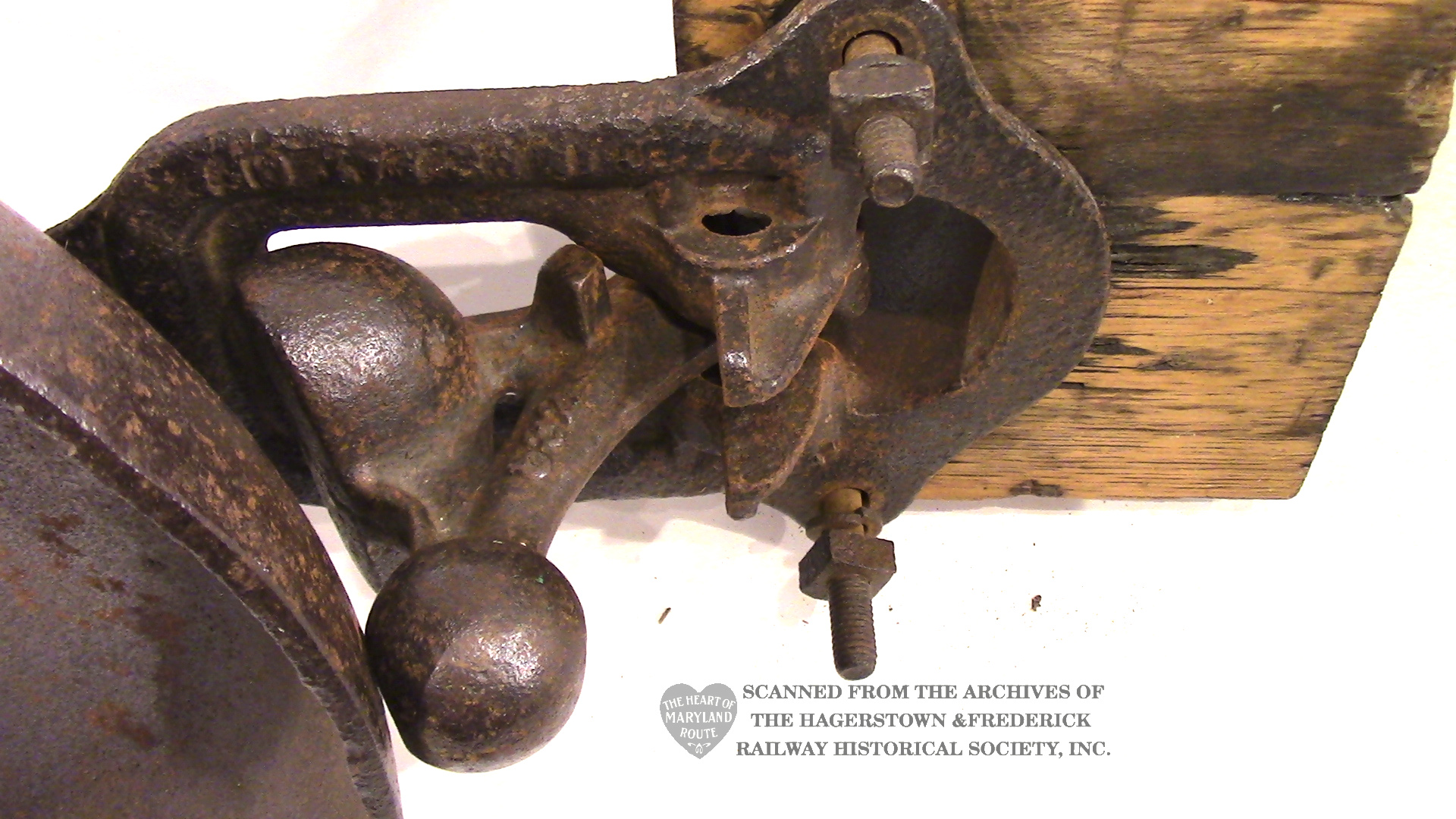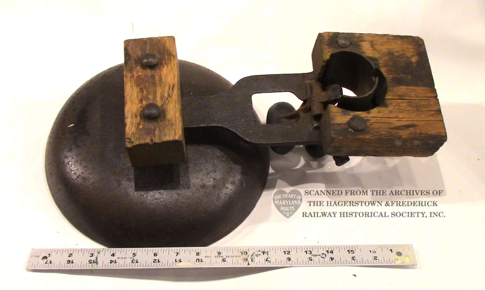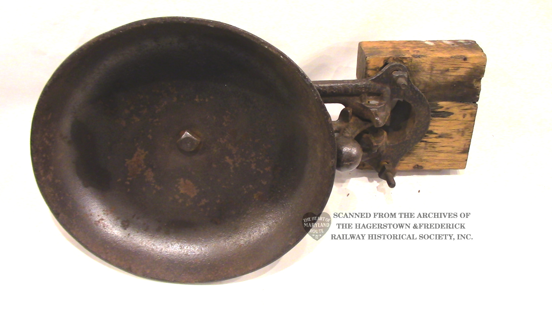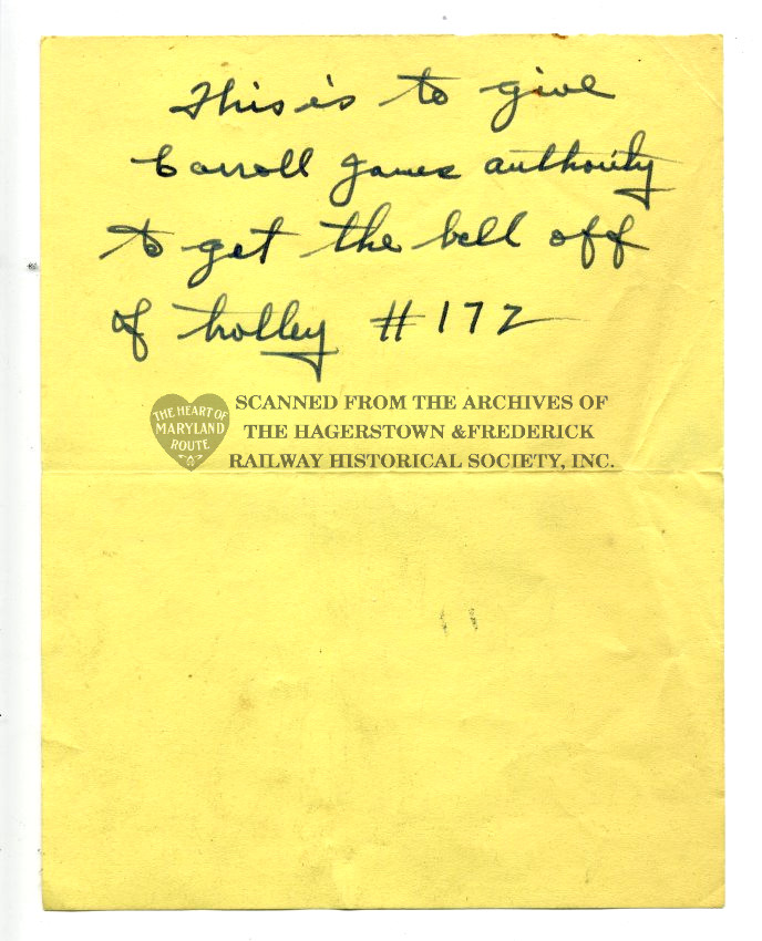 One of two gong bells installed under the floor of H&F #172 by the J.G. Brill Co. when the car was constructed in Philadelphia in 1921. This bell was removed from the car in 1954 after the Last Trolley trip by Carroll James. Included note appears to be written in the hand of R. Paul Smith, President of the Potomac Edison Company at the time giving permission to Mr. James for the removal of the bell.