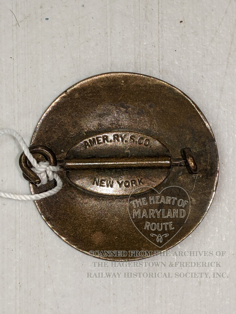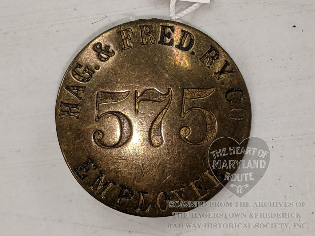 This style of employee badge was assigned to non-railroad, public facing employees of the Hagerstown & Frederick Railway Company. It is unknown at this time who badge 575 was assigned to. Examples of other positions include meter readers, in-home sales representatives for appliances and electrical services, repair technicians and customer service.
