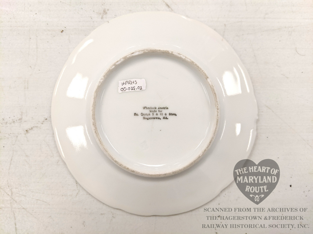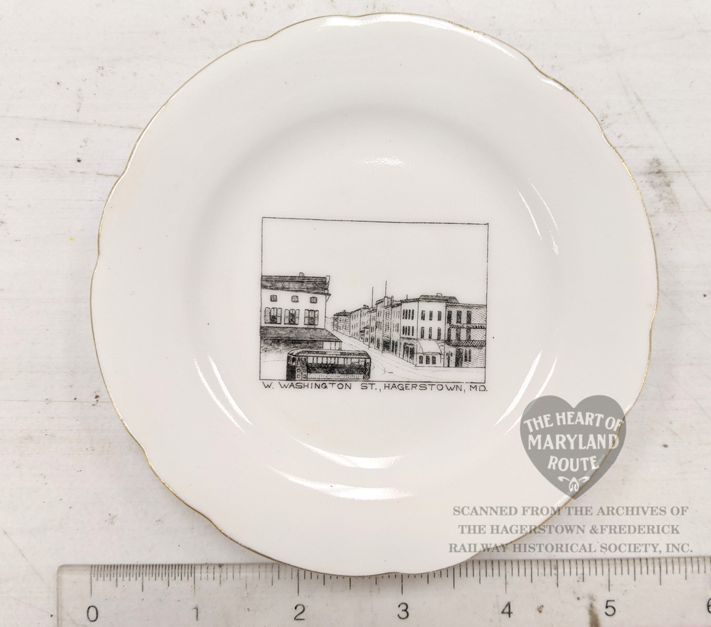 This small round souvenir plate bears drawn artwork within a square border depicting an early interurban in the Square at Hagerstown. Souvenirs such as this were common collectables for visitors to the city and special events.