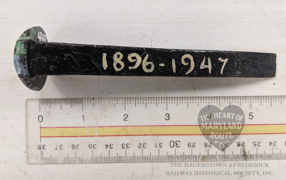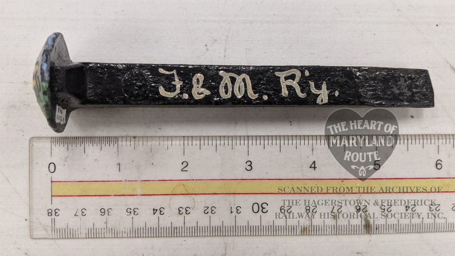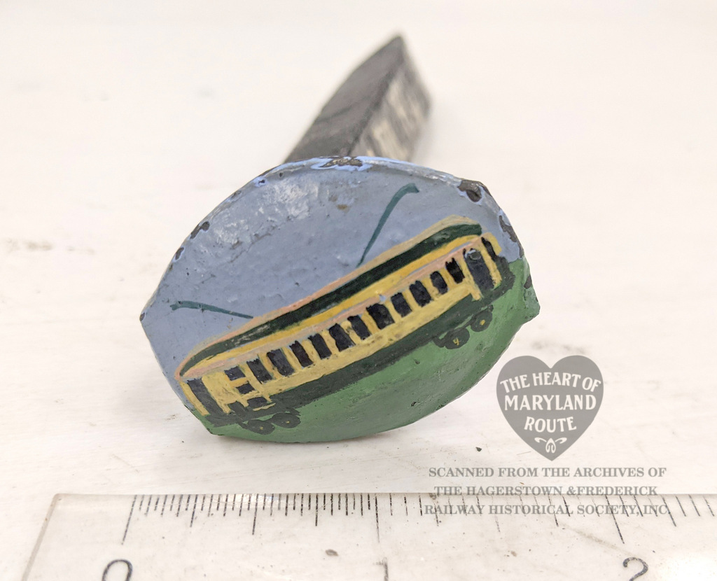 This unique piece of souvenir artwork is an original Frederick & Middletown/H&F spike, likely discovered between Middletown and Myersville and hand painted with the F&M initials and railway dates on the stem of the spike while the head of the spike bears an image showing an approximation of one of the trolleys.