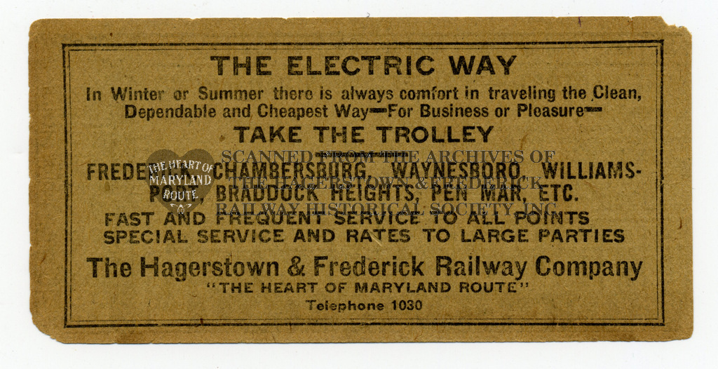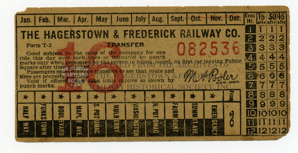 This unused transfer ticket is marked for the 16th day of the month which would have connected a passenger to locations around Hagerstown which the motorman or conductor could have punched to show the passenger’s destination.