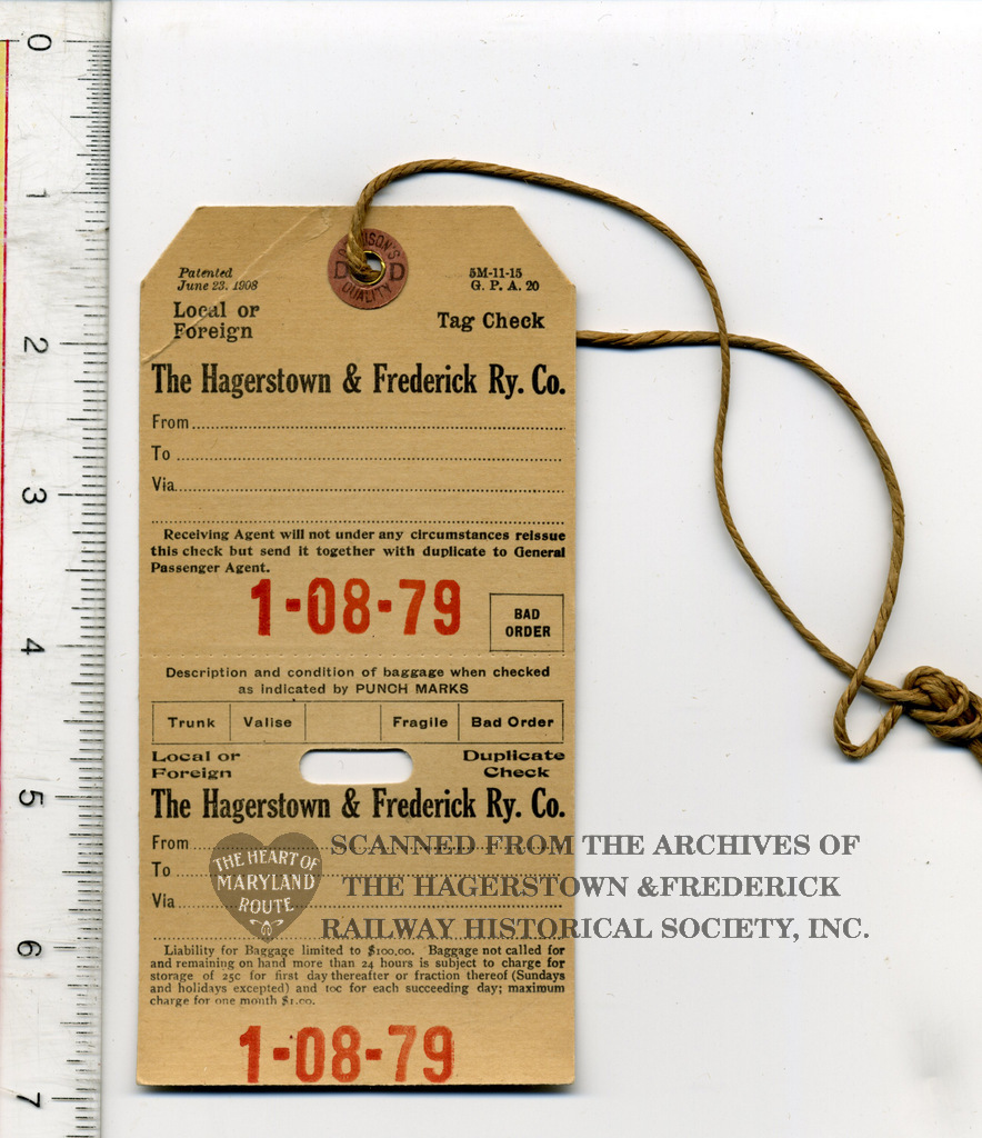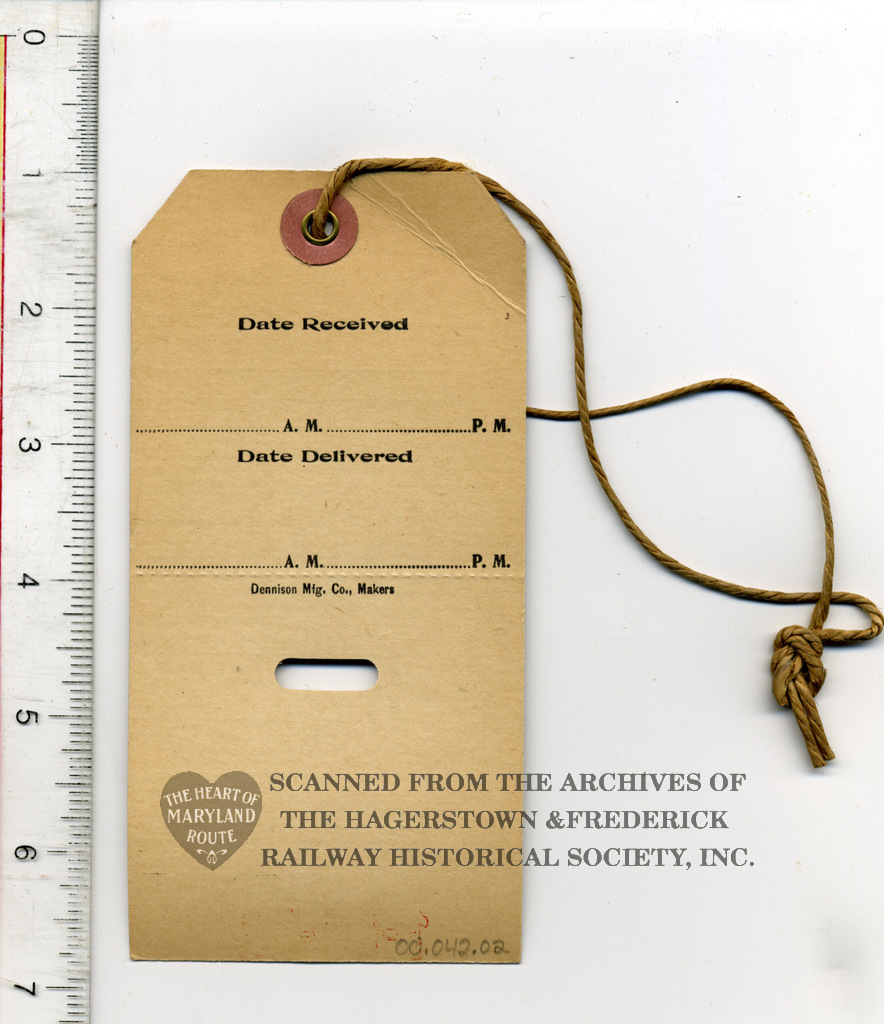 Several of these tags are in the collection of the Society. Like modern airline luggage tags this would be tied to a suitcase to track its origin and destination and the bottom portion retained by the bag’s owner to be exchanged at their destination.