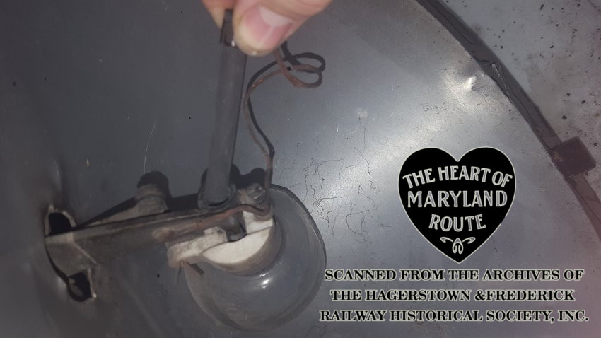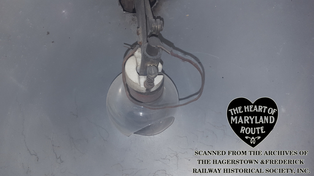 This lamp was illuminated by a carbon rod type bulb. H&F lamps ran on D.C. power, with the body of the fixture grounded to the trolley body and a single pronged, wood handled plug which would be inserted into a wooden-block socket on the underside of the car.