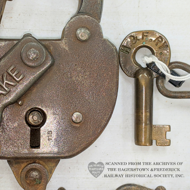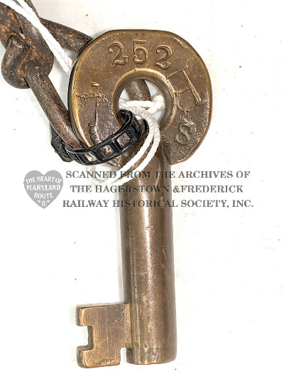 This key was used to open Adlake switch or signal locks. It is unknown which employee key number 252 was assigned to. The key is displayed with compatible Adlake lock #00.32.01