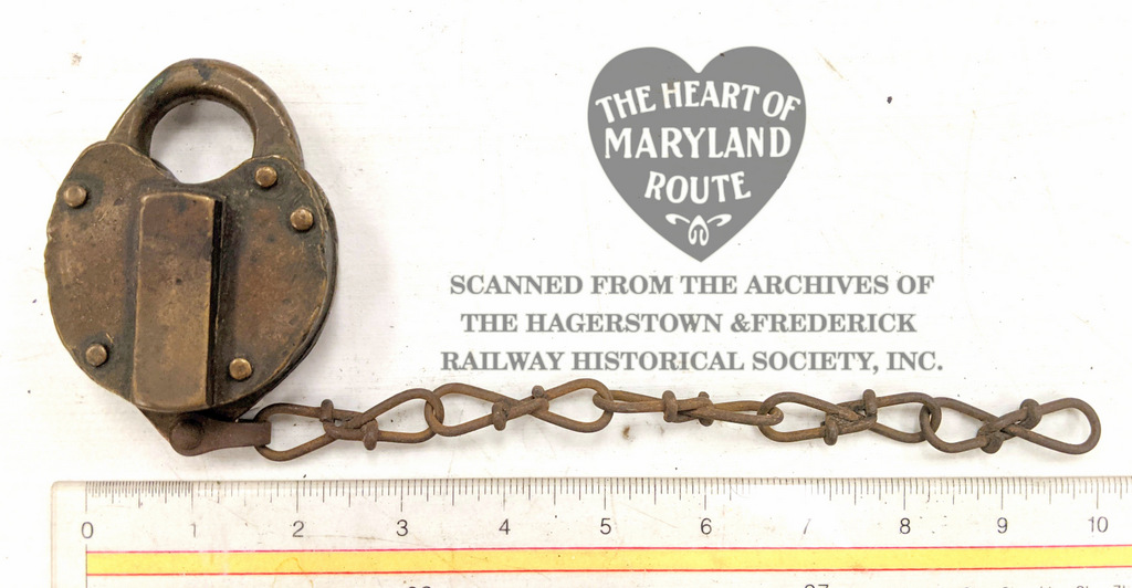 These locks were used by railroad companies most often to secure turnouts, or “switch tracks.” They would be mounted onto a latch that would hold the turnout control lever in place so that only approved employees could change which track trolleys would continue on. The attached chain could be used to secure the lock so that it would not get lost.