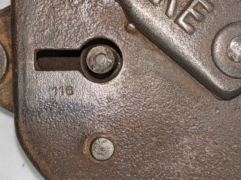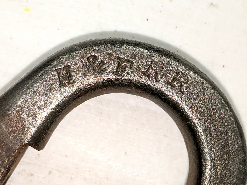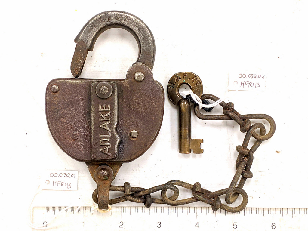This Adlake lock was used on a switch stand or signal somewhere on the H&F system. It is stamped H.& F. RR and bears the number 116 beside the keyhole. The mechanism functions well. The lock is displayed with compatible key 00.32.02