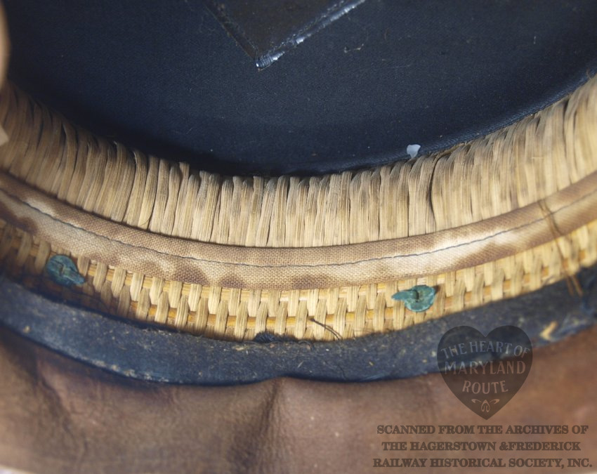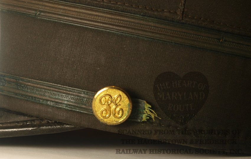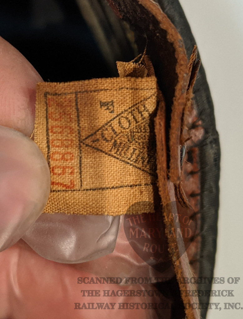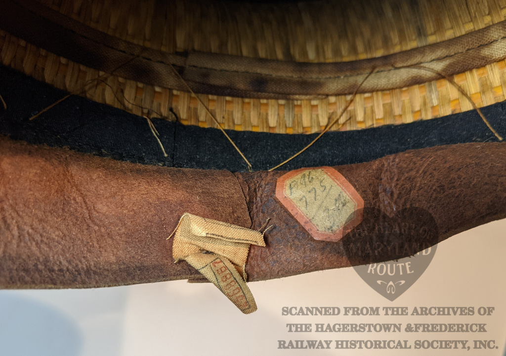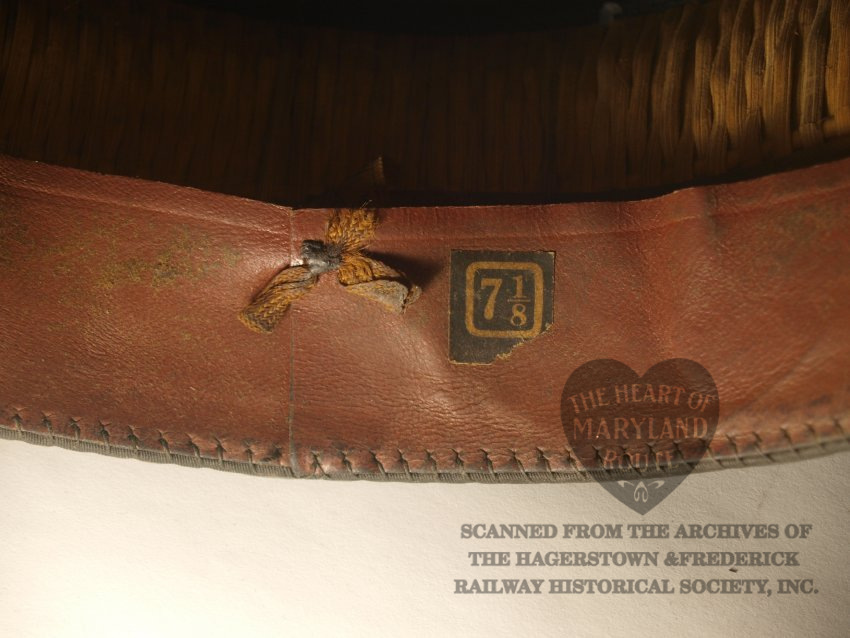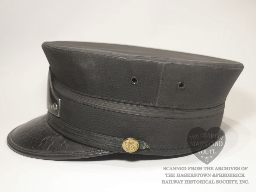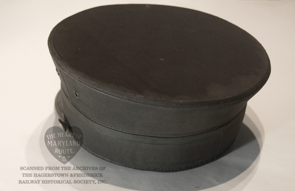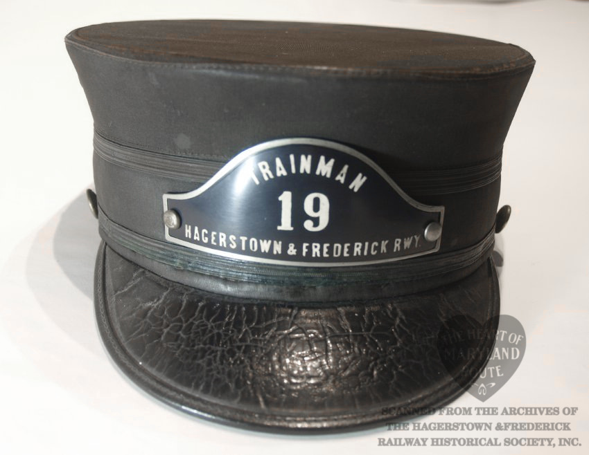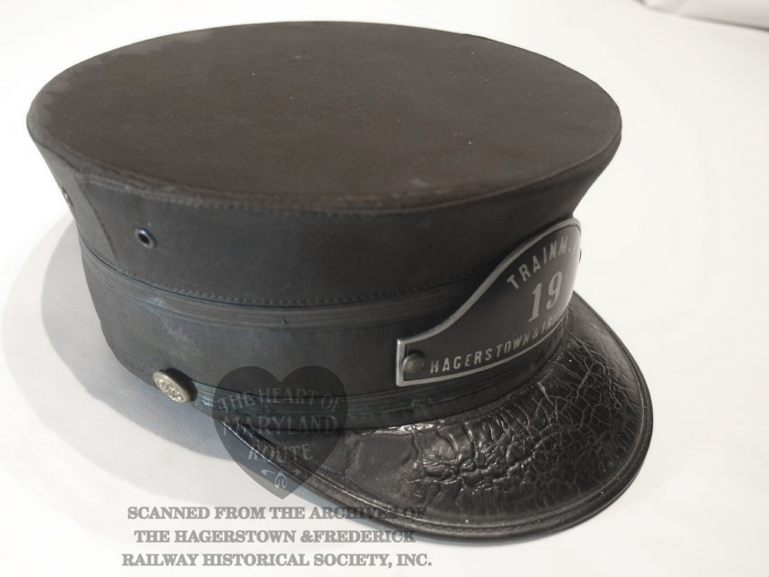 This is an original Hagerstown & Frederick crew cap worn by one of the trolley drivers. Due to limited surviving company documents it is unknown at this time who Badge 19 was assigned to during the period when this style badge was in use. The cap with the affixed badge were donated by the estate of the late artist Sherry Kemp who was known to bring it during her attendance at the Myersville Trolley Festival for which she provided artwork.