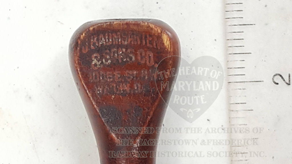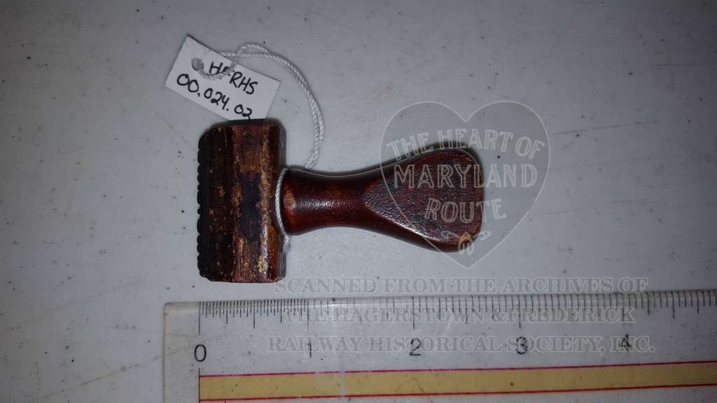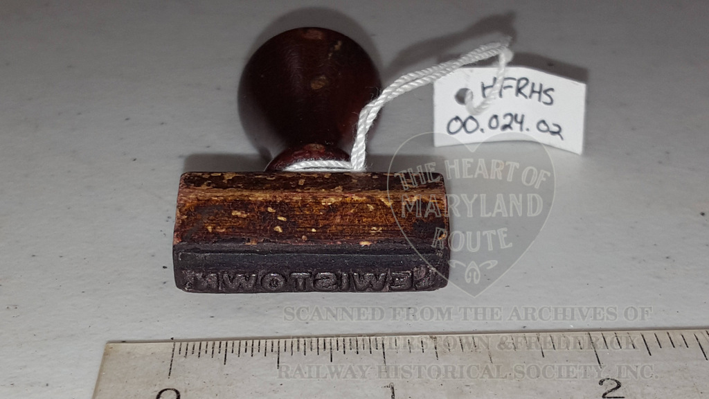 Stamps such as this were used by station agents and other company officials to mark tickets and documents quickly and officially with origin or destination points. This stamp reads “Lewistown”