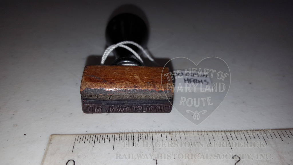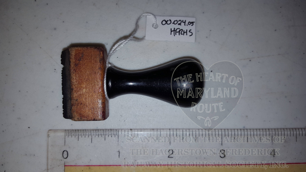 Rubber stamps such as this were used by station agents and other company officials to mark tickets and documents quickly and officially with origin or destination points. This stamp reads “Middletown, MD”