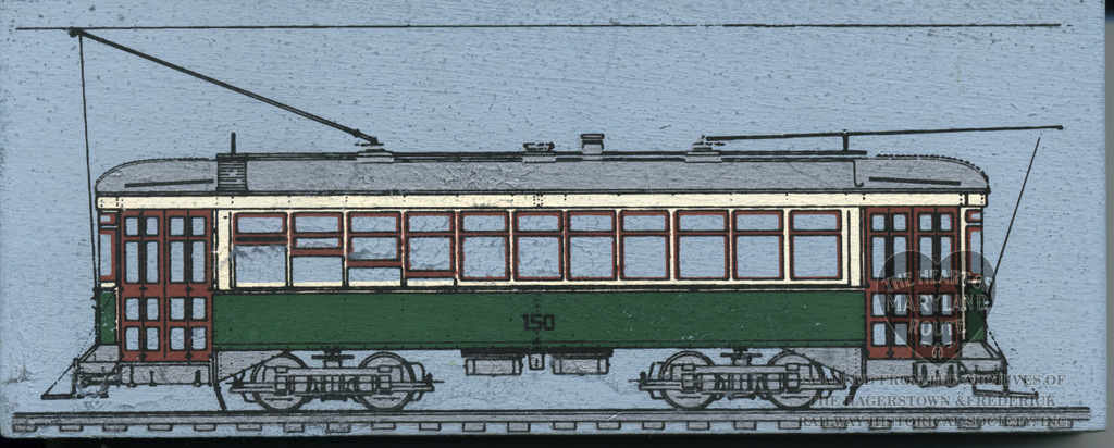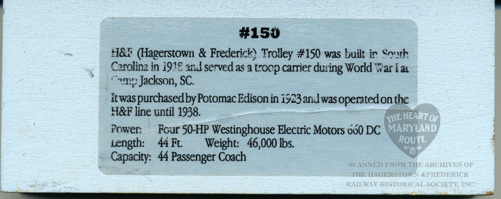 A souvenir sold during the Myersville Trolley Festival, this wooden block decoration bears artwork resembling H&F #150 and a description of the car on the back.