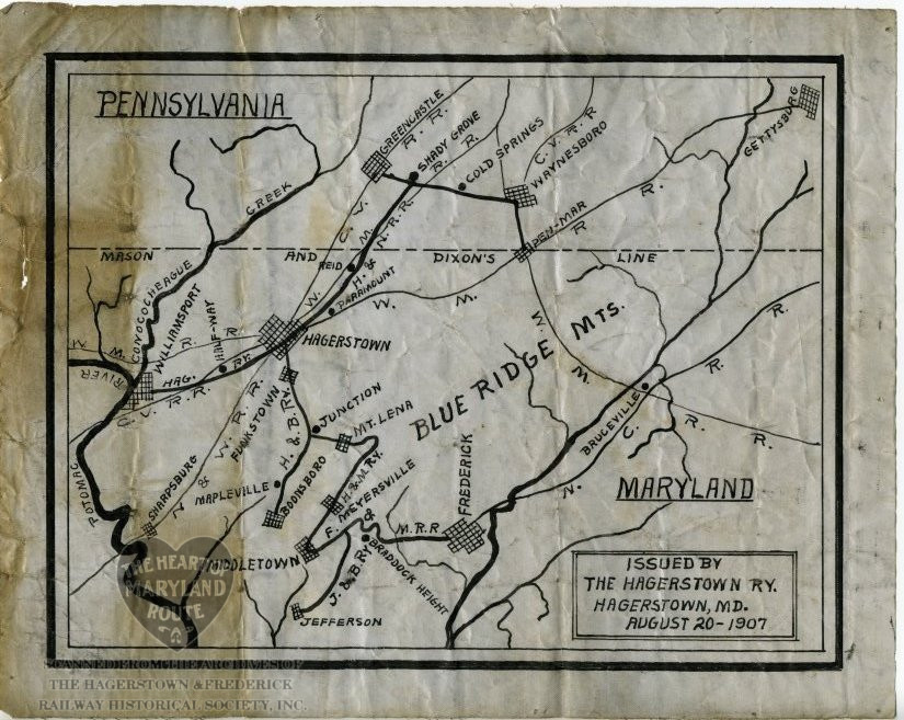 The map shows the Hagerstown Railway system prominently while also showing the Frederick & Middletown route which the railway connected to in Myersville. Missing from the map is the Monocacy Valley Railroad (aka at the time Frederick, Thurmont & Northern) which had not yet become the Washington, Frederick & Gettysburg Railway.