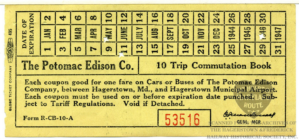 This ticket is one page of a commuter’s one-week discount fare book valid until May 11, 1946. These tickets were valid on “cars or buses” between a point in Hagerstown to the Hagerstown Airport. It is believed this would allow for a passenger to ride a trolley on the Williamsport branch to the square and transfer to a bus for the trip north on Pennsylvania Avenue / Rt. 11 to the airport.
