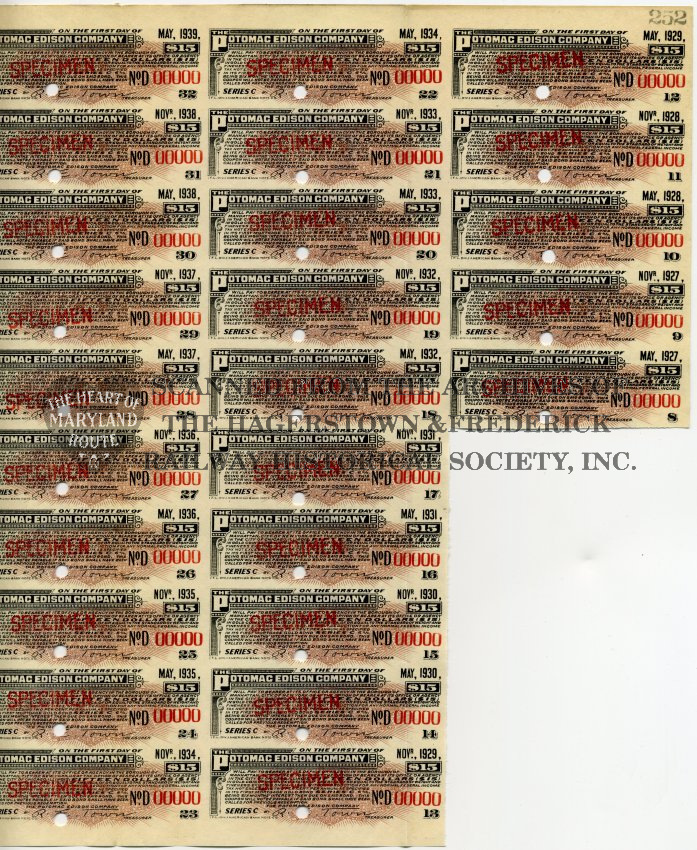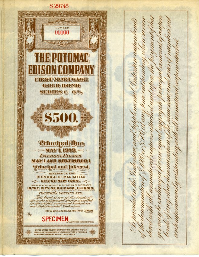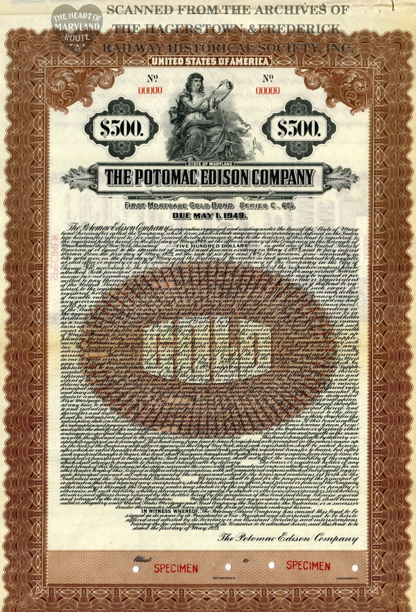 This specimen copy of a Series C, 6% interest Gold Bond certificate was provided to the company by the issuing bank ahead of the 1923 release of bonds for sale. This would have been the first bond sale to raise funds for the company after taking the Potomac Edison name.