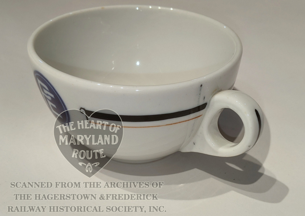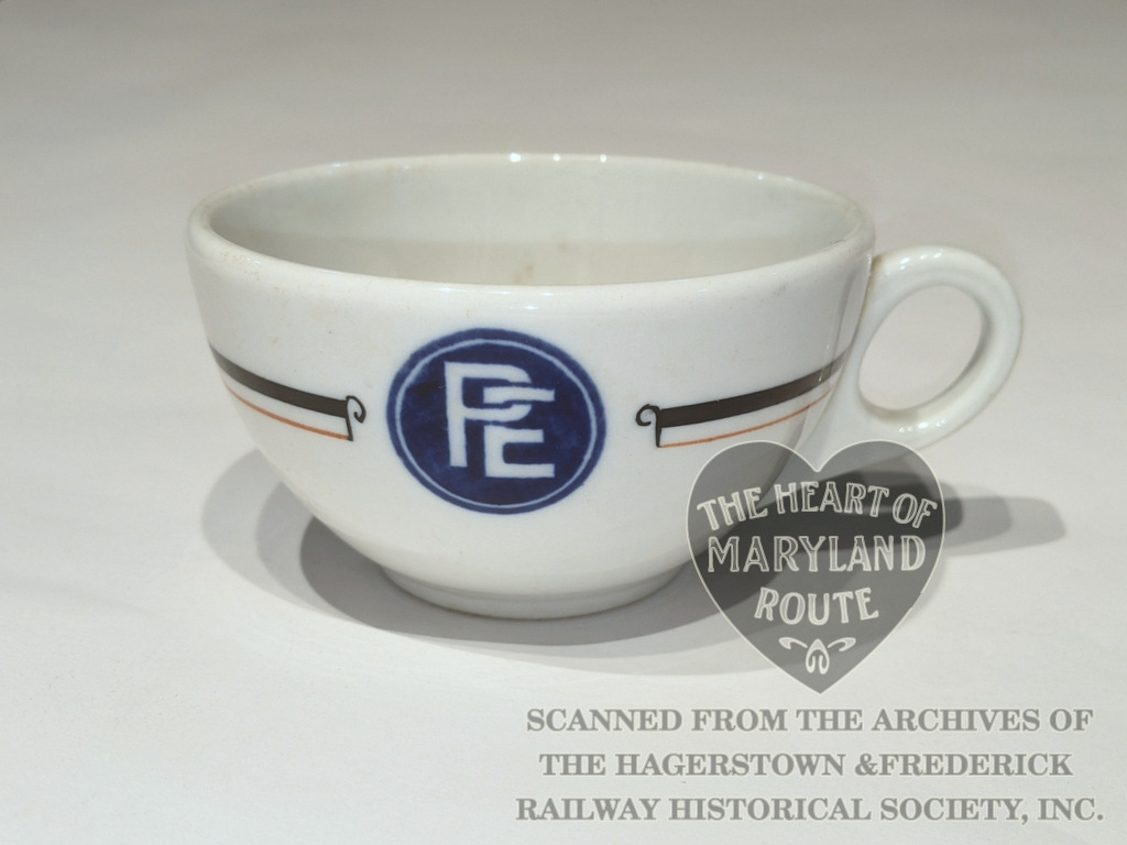 This matching pair of coffee cups bears decorative striping and the Potomac Edison logo. Their exact age and use is unknown however they may have been used in the company offices or provided to employees as gifts or rewards for safety or service.