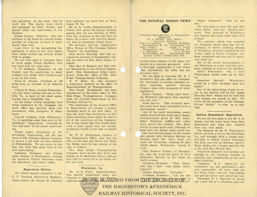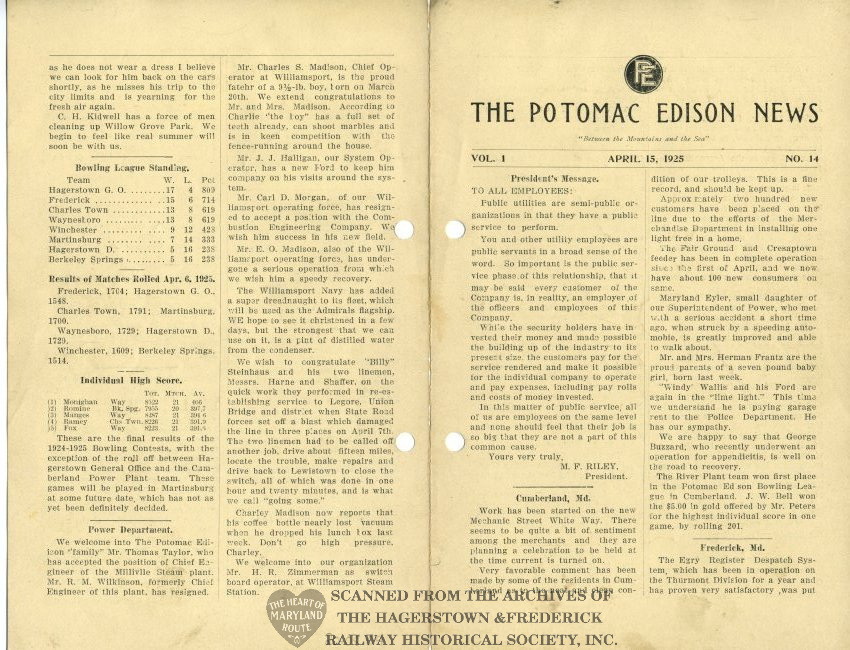 Potomac Edison News was a publication of the company for several decades beginning in 1924. This originally was provided to employees with their bi-monthly paycheck. Each issue provided company updates, encouragement from management to boost morale and personal updates regarding the health and accomplishments of staff.