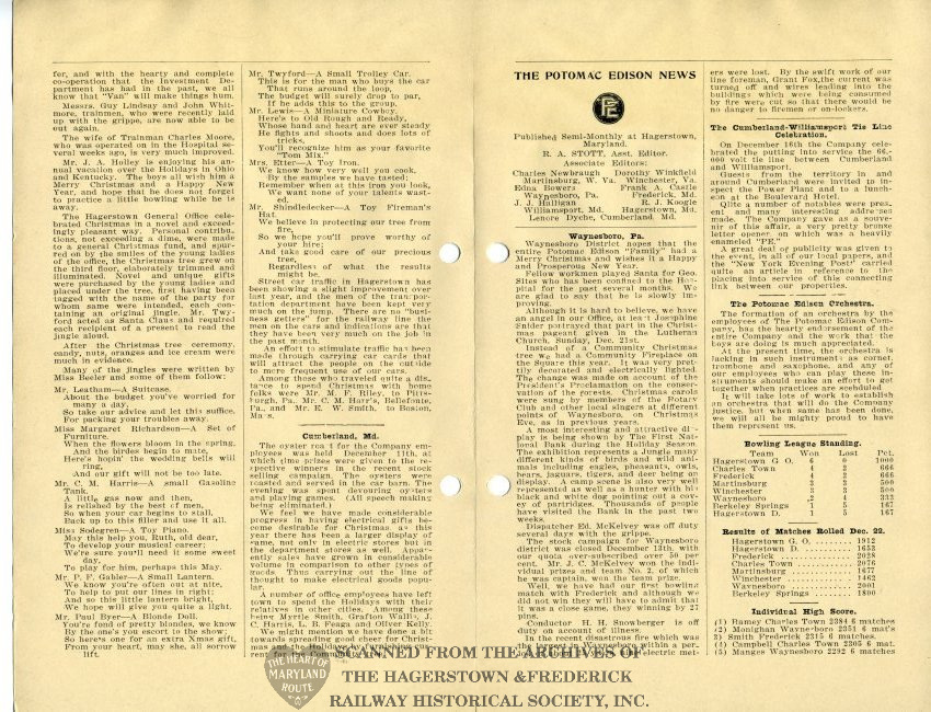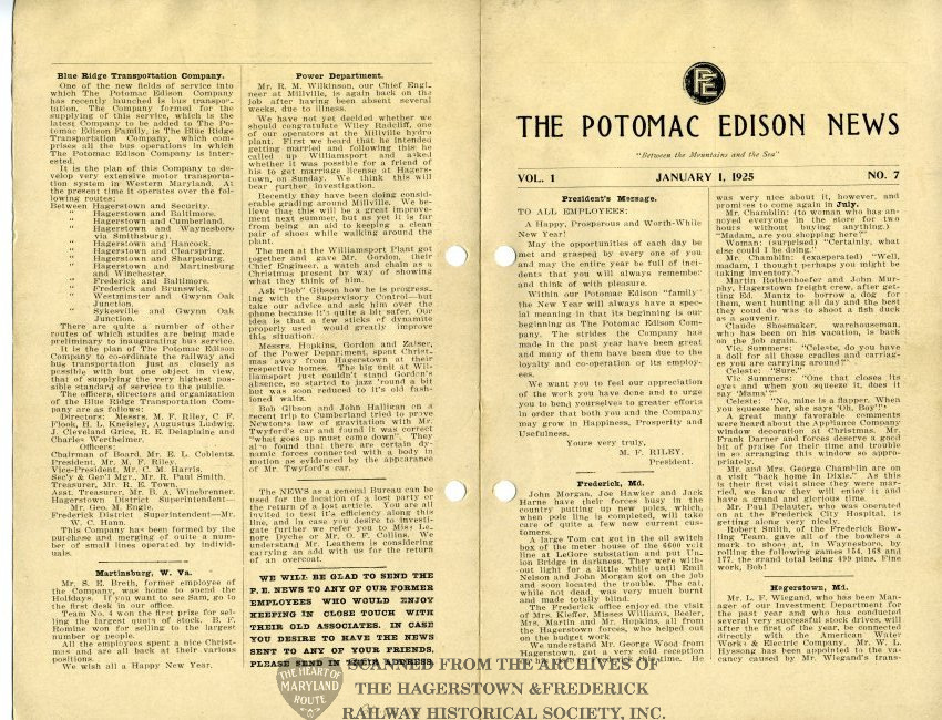 Potomac Edison News was a publication of the company for several decades beginning in 1924. This originally was provided to employees with their bi-monthly paycheck. Each issue provided company updates, encouragement from management to boost morale and personal updates regarding the health and accomplishments of staff.