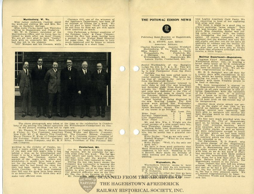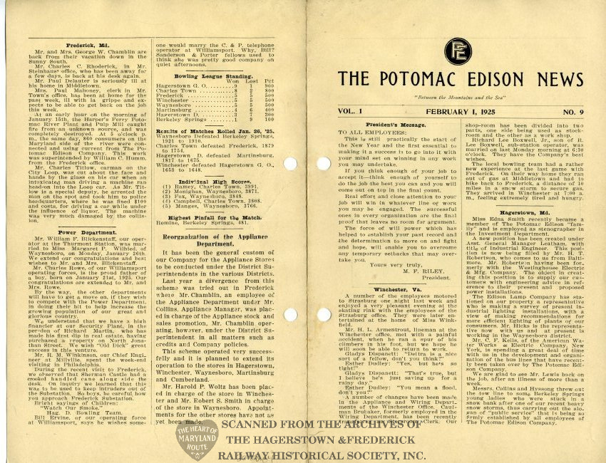 Potomac Edison News was a publication of the company for several decades beginning in 1924. This originally was provided to employees with their bi-monthly paycheck. Each issue provided company updates, encouragement from management to boost morale and personal updates regarding the health and accomplishments of staff.