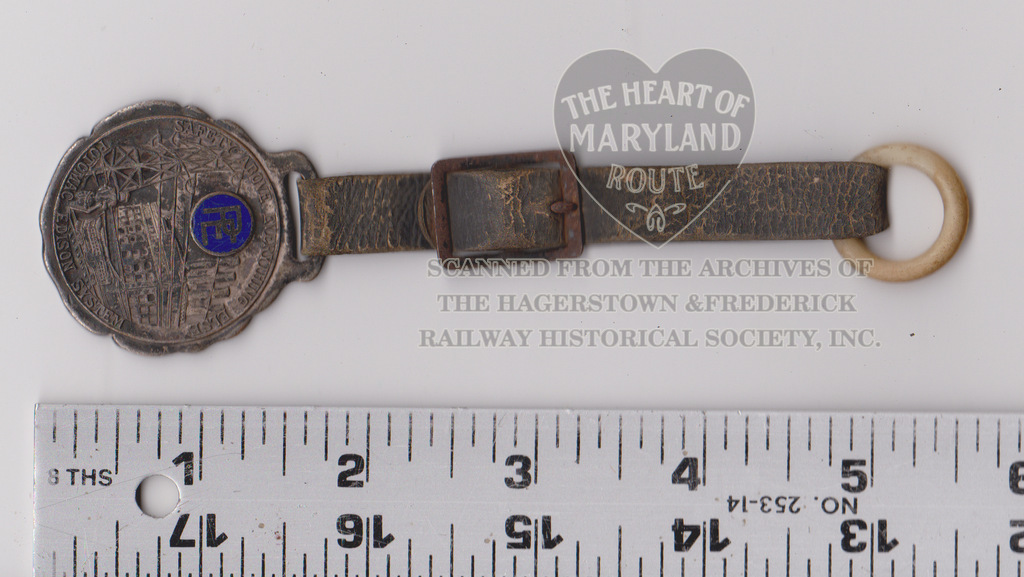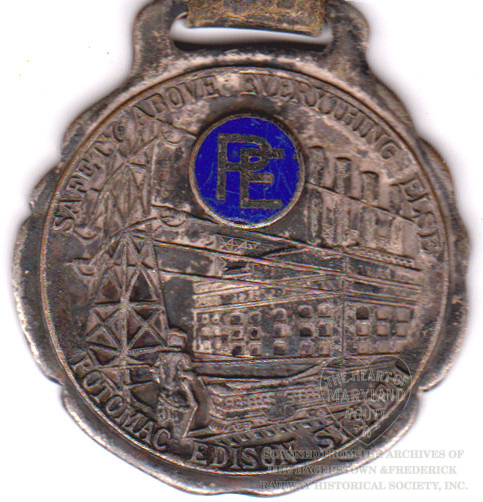 This medallion was most likely issued as a safety reminder for employees to wear with their uniforms or as a departmental recognition for safe practices. It bears the embossed text “Safety Above Everything Else” along the top edge and “Potomac Edison Systems” along the bottom edge, framed around a generic embossed image of a power generation plant, high tension powerline mast and a Peter Witt style streetcar (which the company did not use) as well as the Potomac Edison logo.