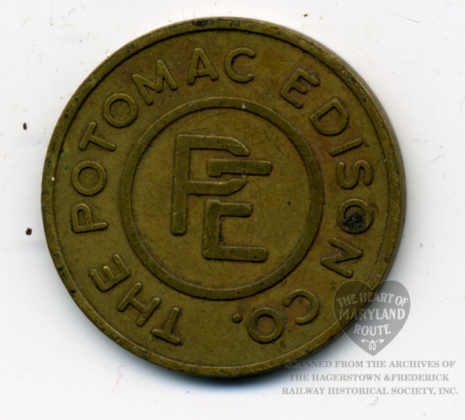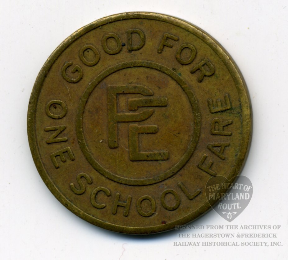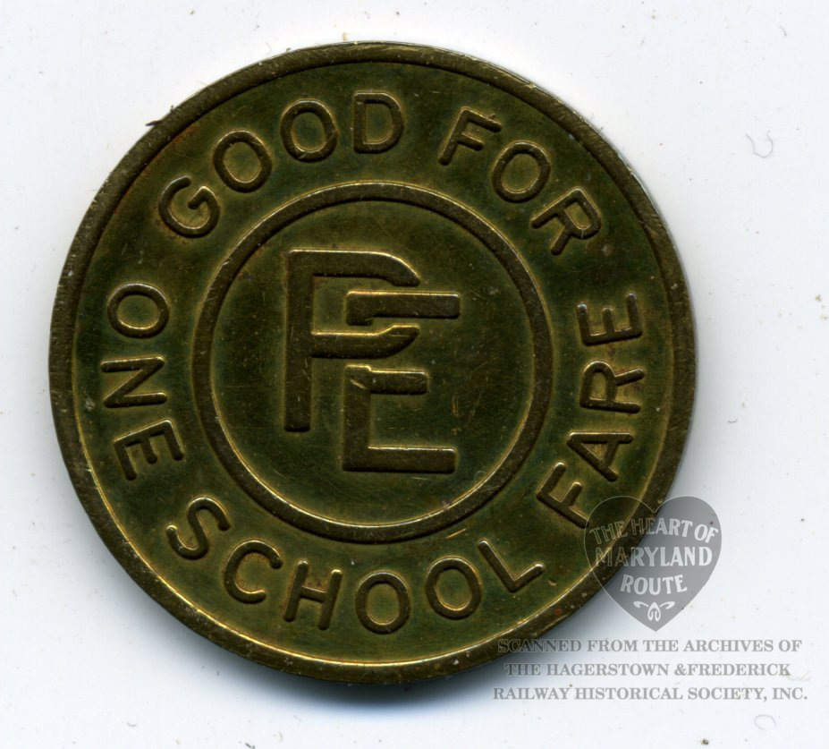 School Fare tokens were purchased at a discount from the company and provided students passage from a point near their home to a point near their school on Potomac Edison owned bus services. This particular token design is commonly attributed to late 1940s bus service in Hagerstown which replaced the trolleys. Similar tokens may have been used in Frederick.