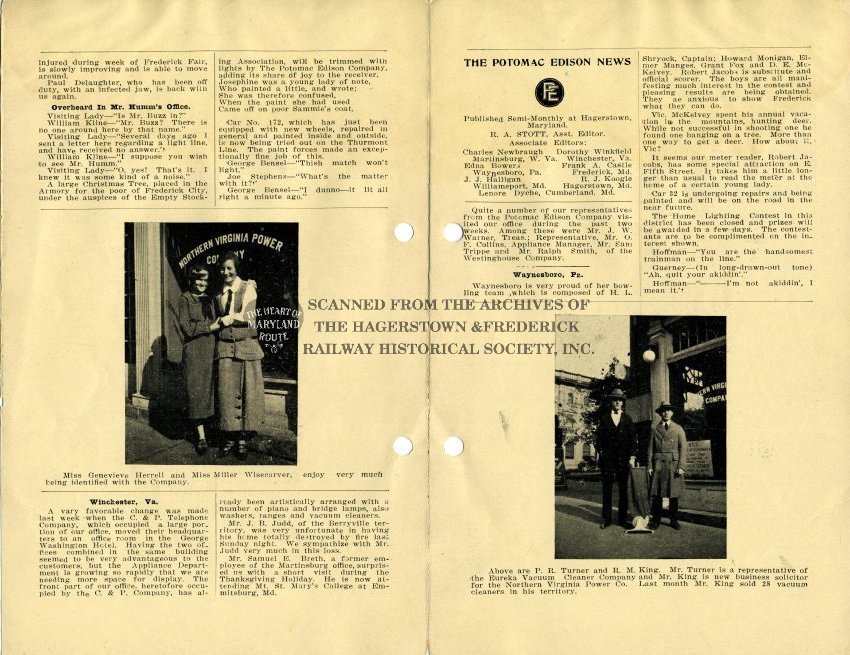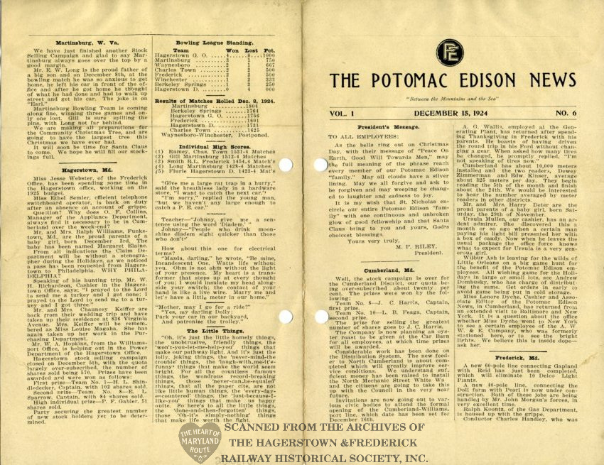Potomac Edison News was a publication of the company for several decades beginning in 1924. This originally was provided to employees with their bi-monthly paycheck. Each issue provided company updates, encouragement from management to boost morale and personal updates regarding the health and accomplishments of staff.