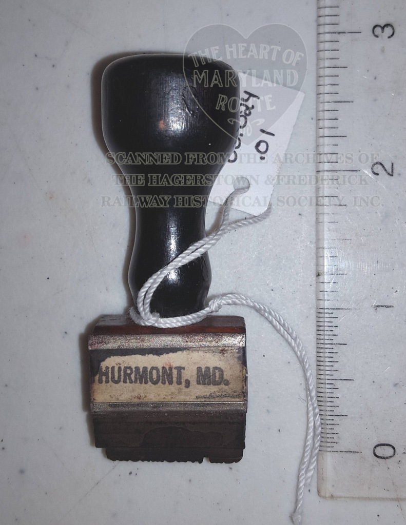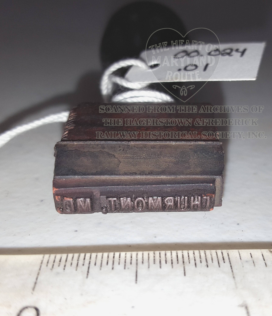 Stamps such as this were used by station agents and other company officials to mark tickets and documents quickly and officially with origin or destination points. This stamp reads “Thurmont, MD”